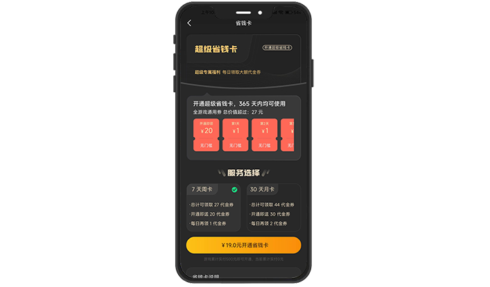 开通省钱卡服务,立即获得相应平台币,然后在期限内每天可领取固定平台币,产品价格、平台币数量后台可进行设置,构建不一样的省钱周卡月卡